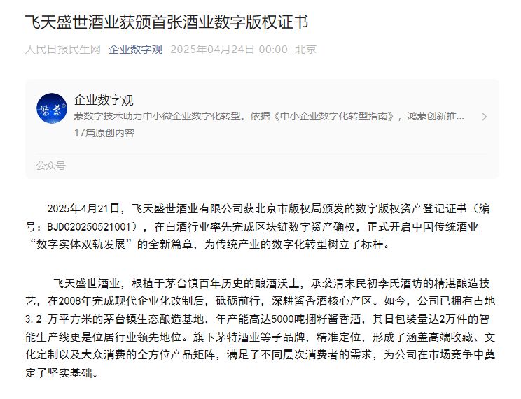2025年4月21日,飞天盛世酒业有限公司获北京市版权局颁发
