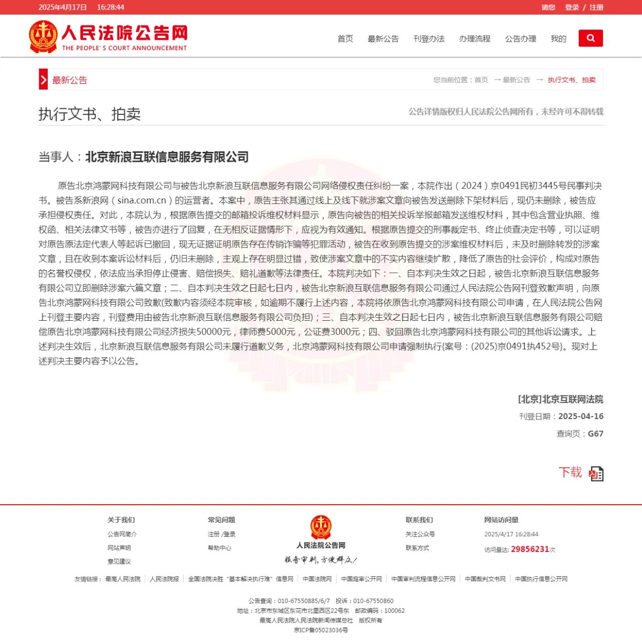 当事人:北京新浪互联信息服务有限公司原告北京鸿蒙网科技有限公
