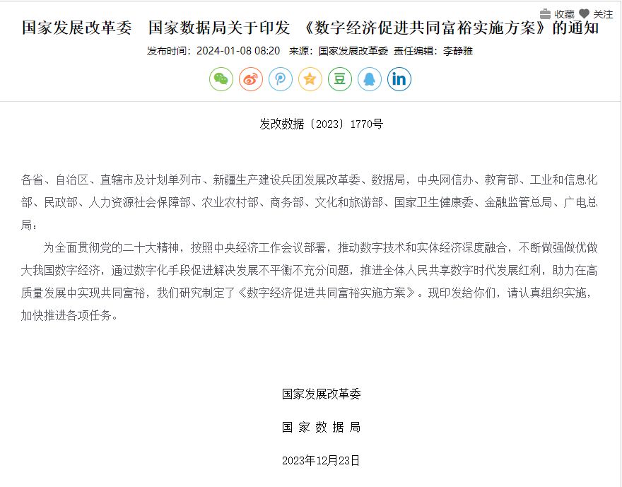 国家发展改革委国家数据局关于印发《数字经济促进共同富裕实施方