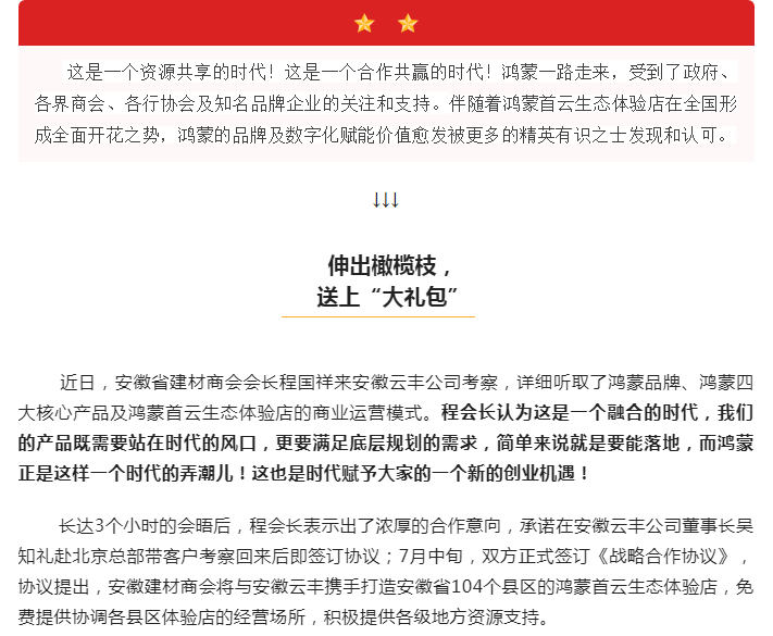 重磅利好来了,安徽建材商会为鸿蒙落地安徽各县区免费提供协调体验场所!