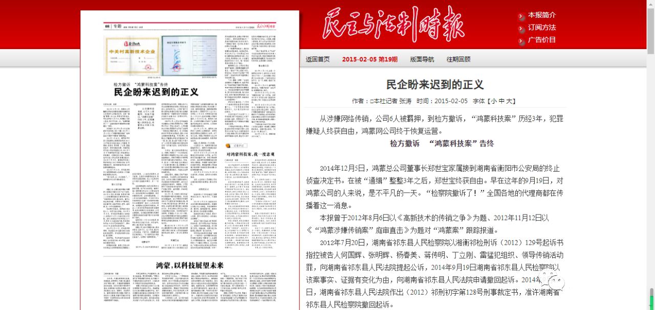 由于超前的技术,鸿蒙公司被无辜污蔑成传销,被打压了3年,通过艰苦weiquan盼来了迟到的正义《民主与法制报》