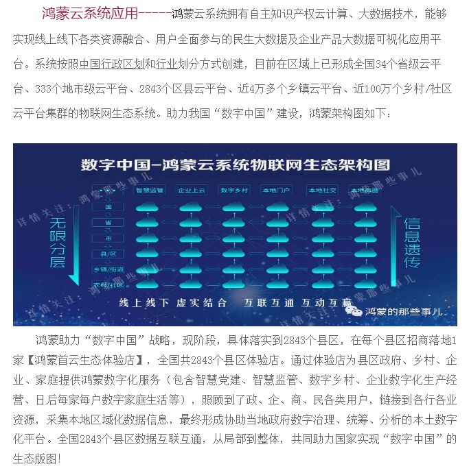 发布者:鸿蒙助力“数字中国”战略,现阶段,具体落实到2843个县区,在每个县区招商落地1家【鸿蒙首云生态体验店】,全国共2843个县区体验店。通过体验店为县区政府、乡村、企业、家庭提供鸿蒙数字化服务(包含智慧党建、智慧监管、数字乡村、企业数字化生产经营、日后每家每户数字家庭生活等),照顾到了政、企、商、民各类用户,链接到各行各业资源,采集本地区域化数据信息,最终形成协助当地政府数字治理、统筹、分析的本土数字化平台。全国2843个县区数据互联互通,从局部到整体,共同助力国家实现“数字中国”的生态版图!