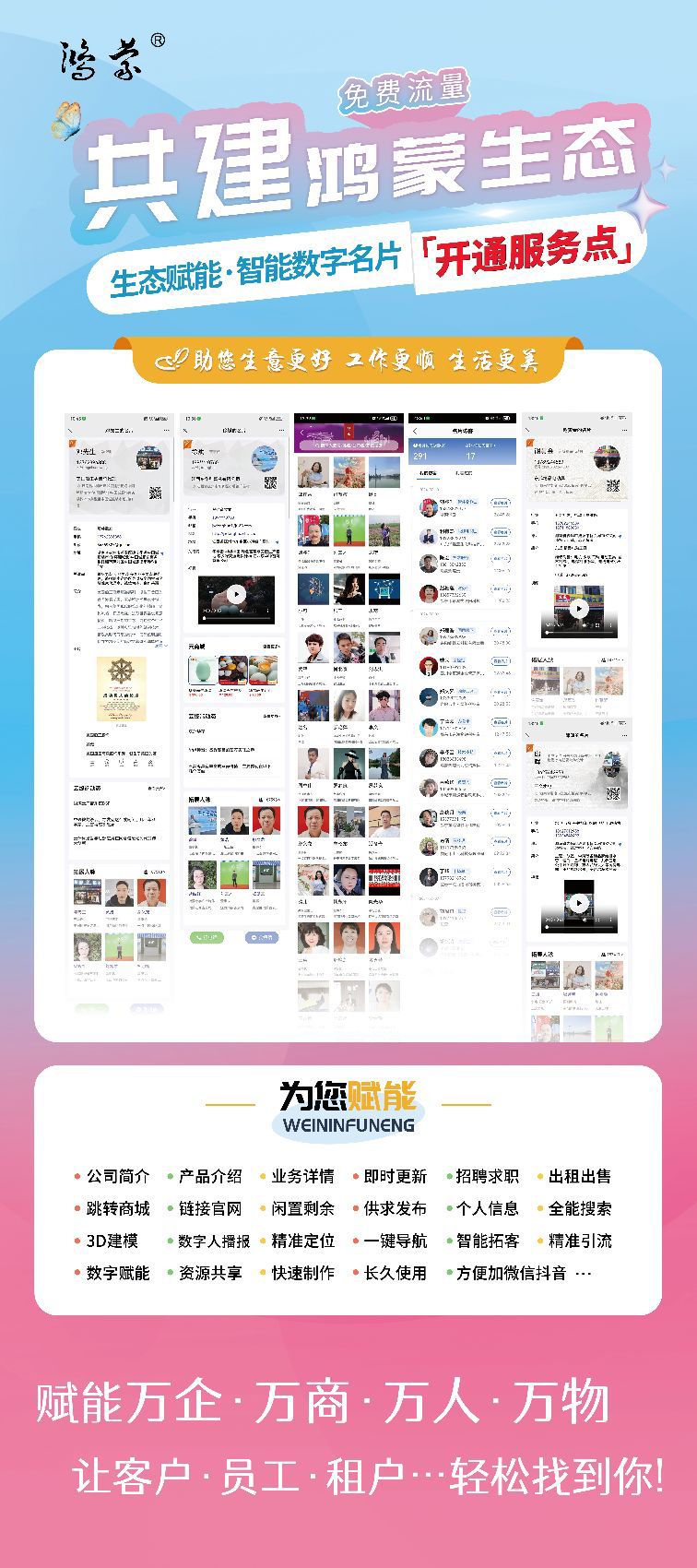 自鸿蒙数字名片7月份上线以来,已有18万 用户积极参与制作鸿蒙数字名片的数字浪潮中,体验名片带来的诸多好处和便利。为了更好的服务用户,我们将开启长期的【鸿蒙数字名片明星榜】的推荐活动。会定期搜集、甄选平台中制作优良、特色、创新型的优质名片,通过平台日益壮大的数据流量帮其免费展示推广,增加优质名片的访问量,曝光度!(欢迎推荐!)