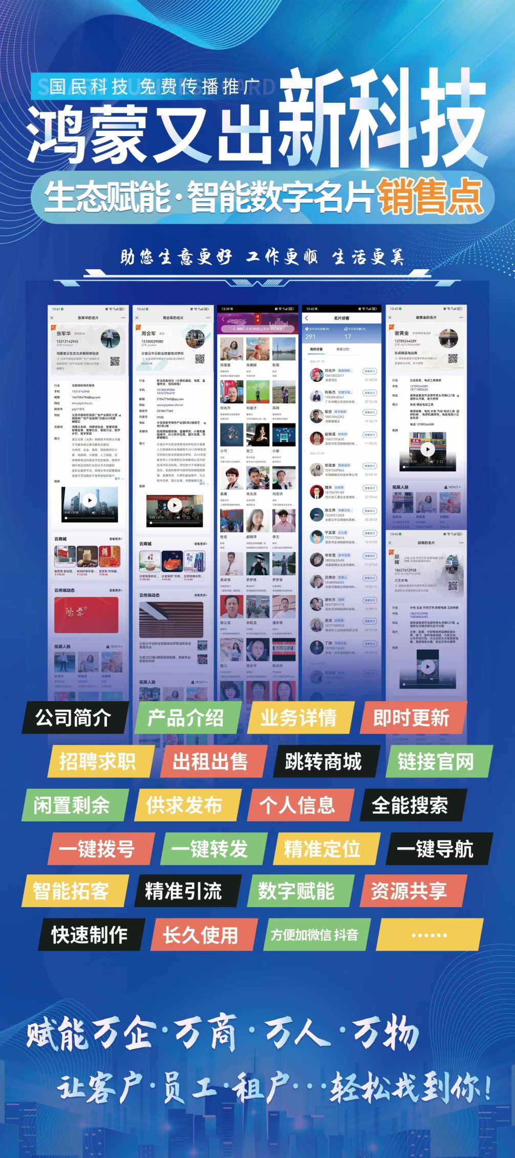 4.鸿蒙数字名片能够形成本地生态圈,与全国的人脉数据互通,开拓您的人脉资源池,拓展您公司的业务;是树立品牌形象,延展业务的得力助手。