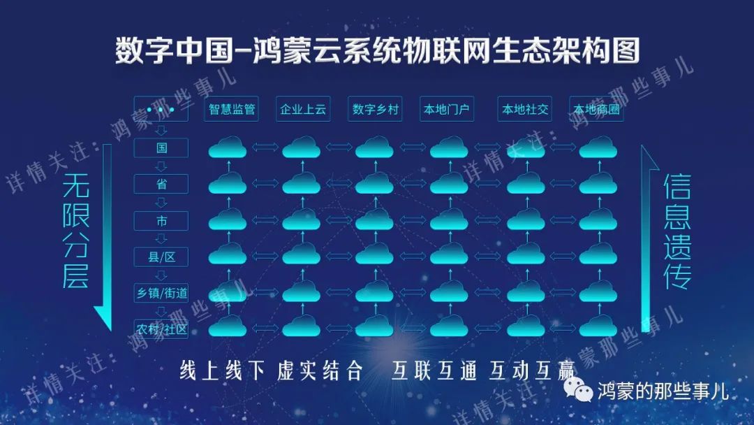蒙云系统拥有自主知识产权云计算、大数据技术,能够实现线上线下各类资源融合、用户全面参与的民生大数据及企业产品大数据可视化应用平台。系统按照中国行政区划和行业划分方式创建,目前在区域上已形成全国34个省级云平台、333个地市级云平台、2843个区县云平台、近4万多个乡镇云平台、近100万个乡村/社区云平台集群的物联网生态系统。助力我国“数字中国”建设,鸿蒙架构图如下: