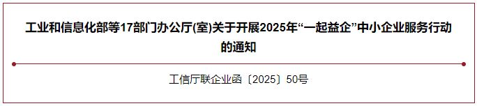 为深入贯彻党的二十大和二十届二中、三中全会精神,落实中央经济工作会议部署,高质量完成《“十四五”促进中小企业发展规划》目标任务,促进中小企业专精特新发展,工业和信息化部等17部门共同组织开展2025年“一起益企”中小企业服务行动。