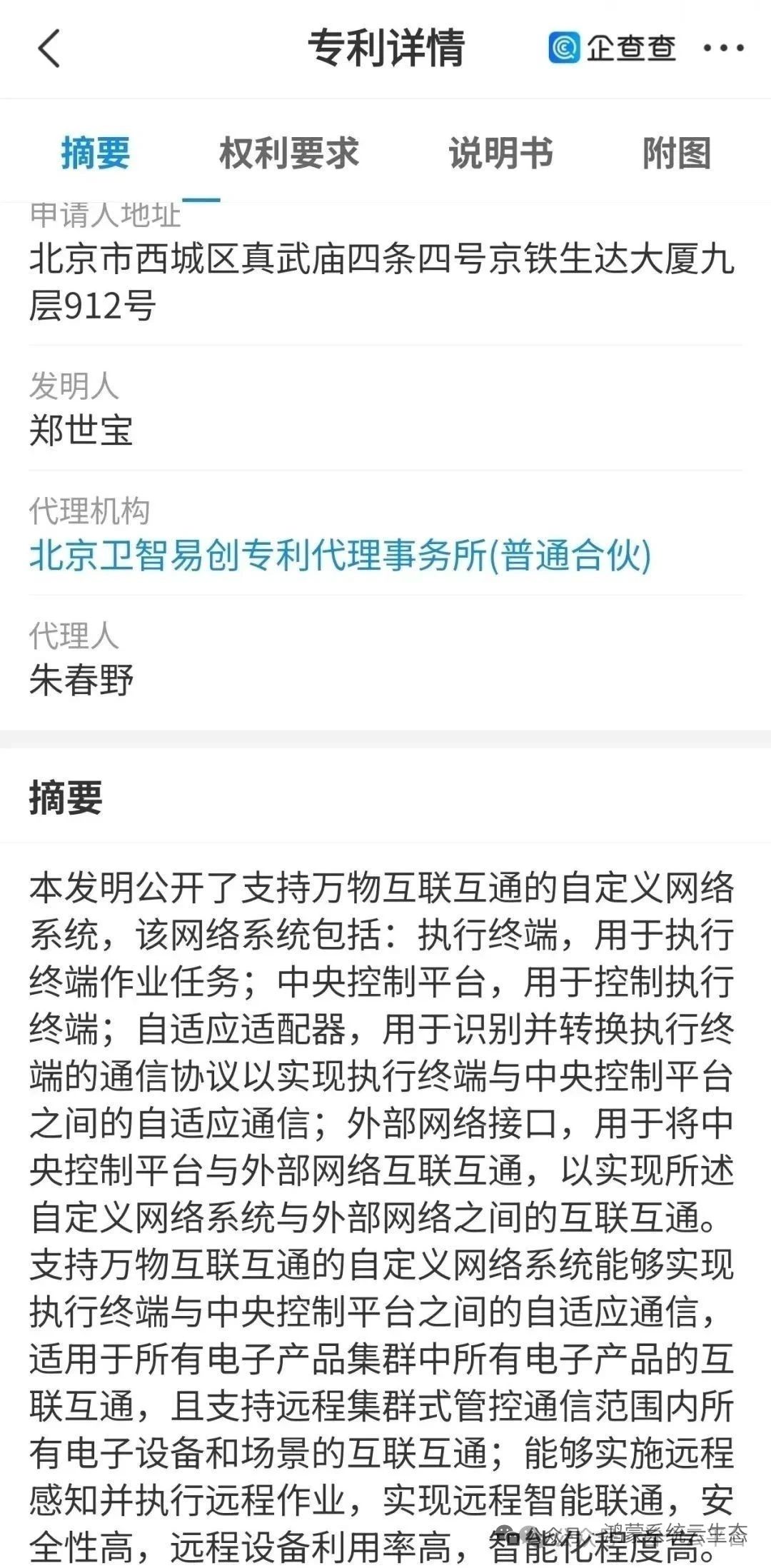 鸿蒙公司创始人郑世宝获得支持万物互联互通的自定义网络系统、自定义连接方法的发明专利