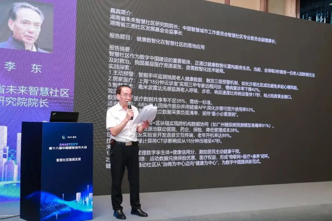 李东在《健康数智化在智慧社区的落地应用》演讲中,展示了智能健康管理如何提升社区居民生活品质。